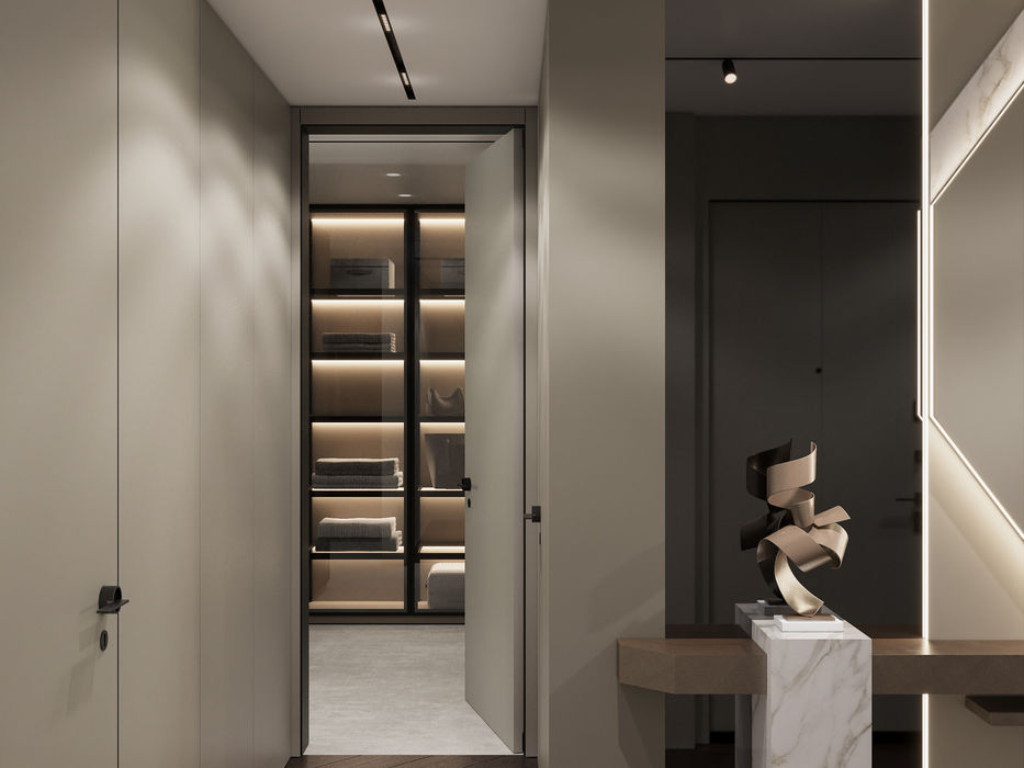 Скрити гардеробни в антрето, минималистични тапетни врати и множество огледала за визуален простор.