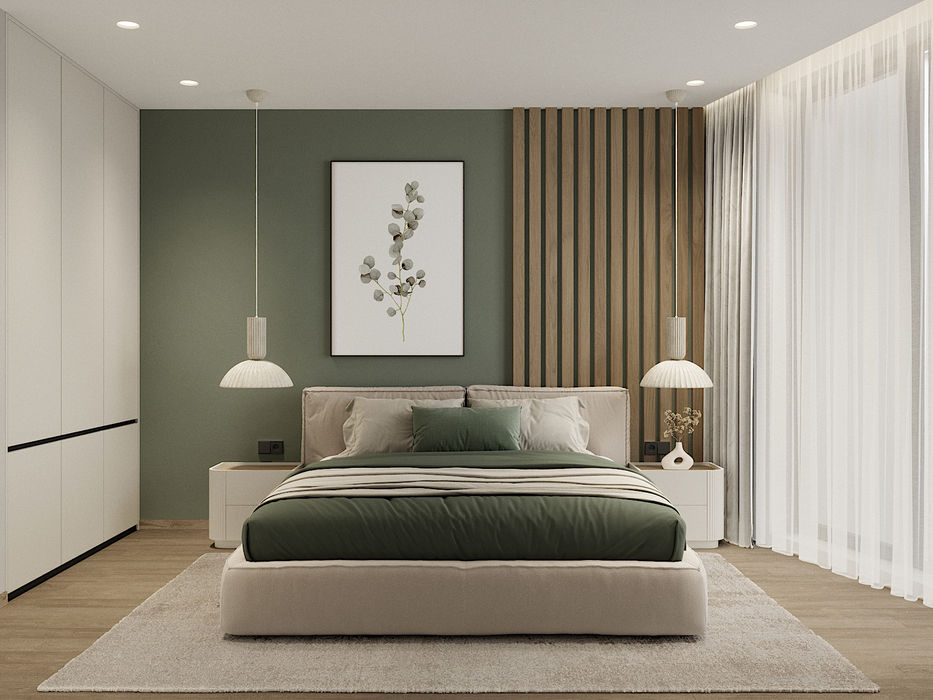 Спалнята е издържана в маслиненозелено, с MDF панели зад леглото, вграден гардероб и зелени акценти в мебелите.